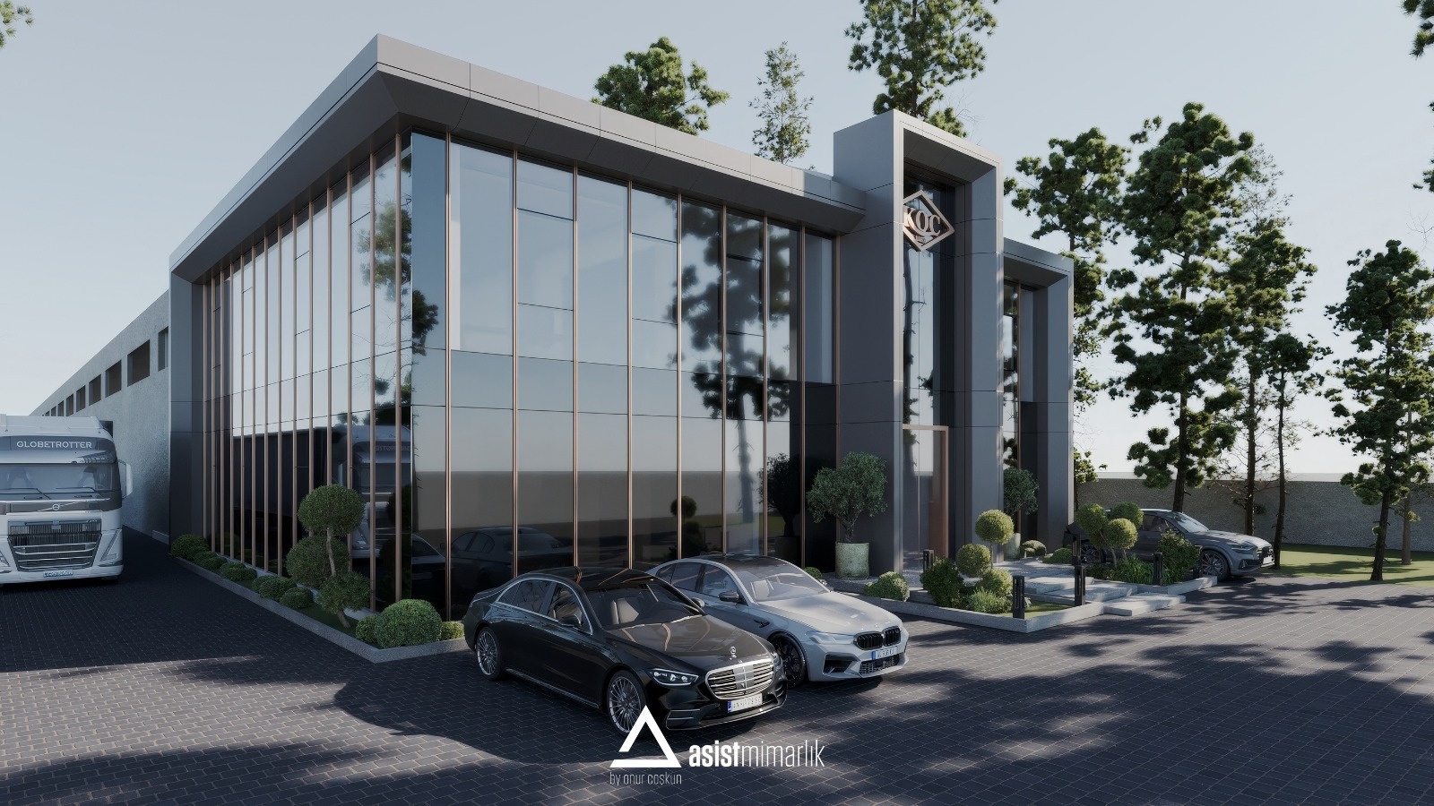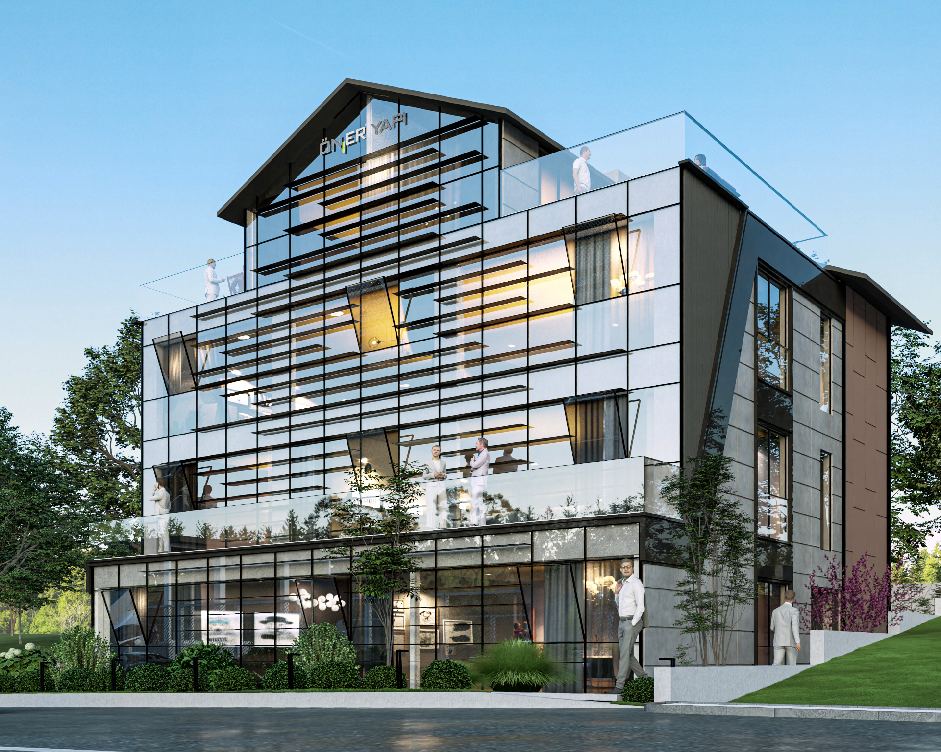 Cam tutucular, çelik taşıyıcılar, kanopiler ve cam kullanılarak ol...